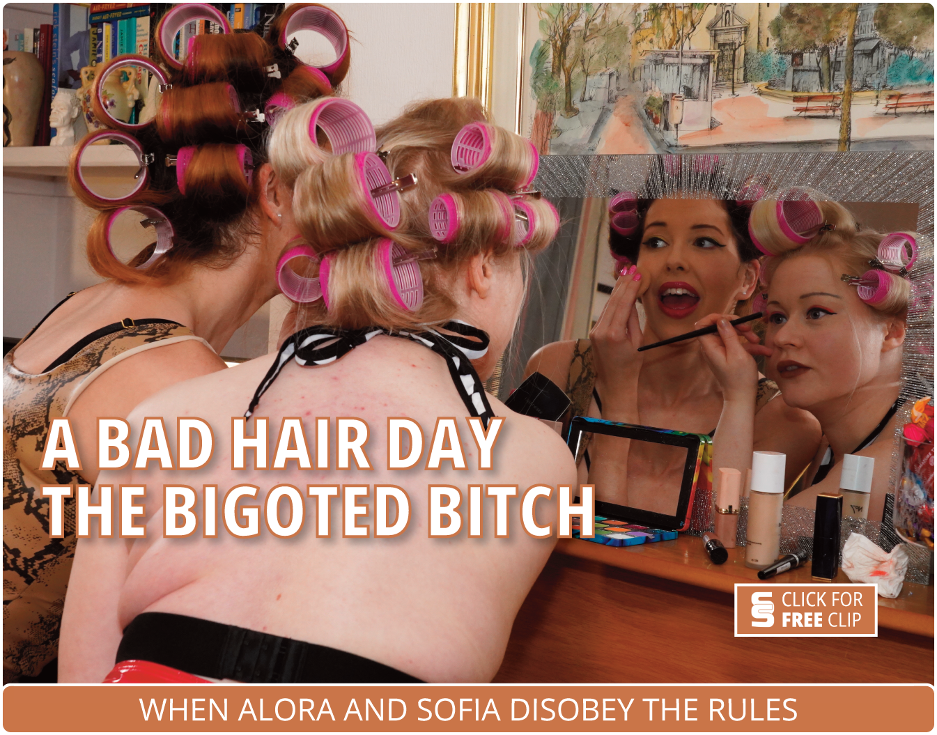 Alora has a new girlfriend and as she has the house to herself, she has invited her around. They are planning to go to a lesbian sex party and are getting ready for the party together. Both girls are dressed in latex, their hair is in curlers, and they are applying their makeup. Imagine Alora’s horror and surprise when she hears the door. She knows that her Stepmom will freak out if she finds out she is a lesbian. Despite Alora being an adult, her Stepmom firmly believes in corporal punishment and uses it without any qualms. She firmly believes that if you live under her roof you abide by her rules. When she sees Alora and Sofia she realises that they are more than friends. She questions her Stepdaughter and Alora denies it. This does not deter her from putting them both over the knee at the same time one each side and smacking their bare bottoms hard.